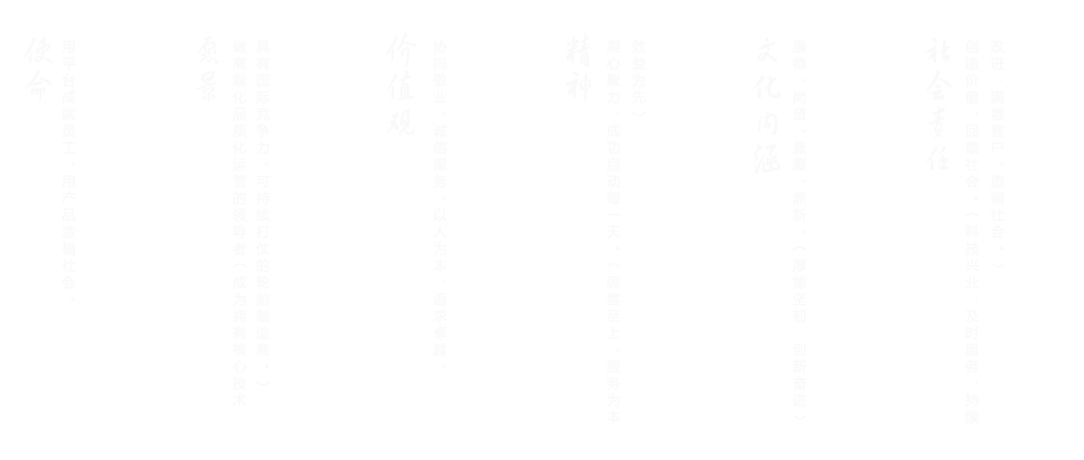 吉路尔人站在一个发展中的制高点,摒弃传统生产模式,大力推进新旧动能转换,提高智能制造装备水平,加大力度改进自动化连续生产工艺,全力继续提高产品质量,全身心投入到研发新时代、新空间、新需求、新型全适应性轮胎产品。“做高端品质化运营的引领者”是我们亘古不变的纲领;“用平台成就员工、用产品造福社会”是我们毕生的使命;"托起、成就、梦想”是我们崇尚完美的境界。我们将带着美好的夙愿、用我们的勤劳和智慧来实现我们的员工梦、企业梦、中国梦。